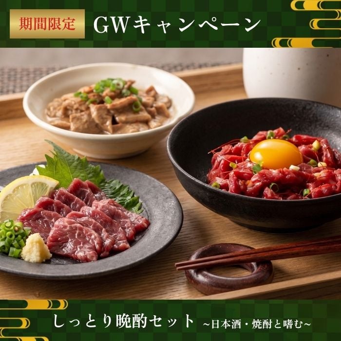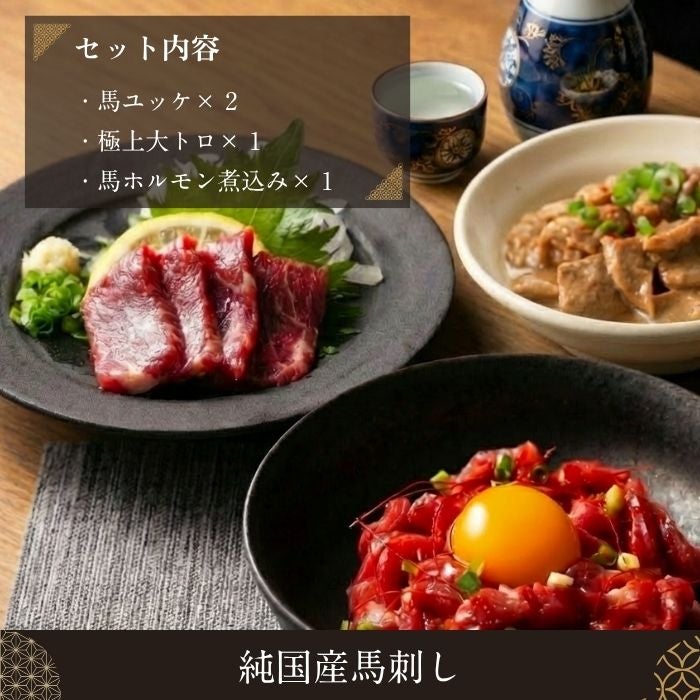 純国産の馬ユッケ・大トロ・馬ホルモン煮込みを合わせた全3種が、ゆったりとした晩酌のひとときをお楽しみいただけるセットとなっております。