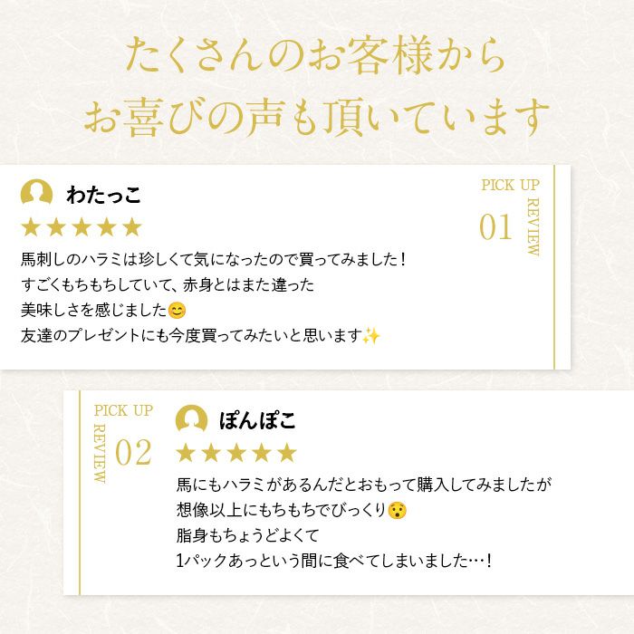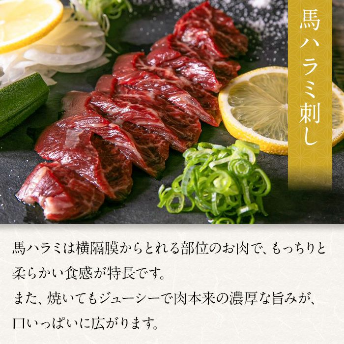 横隔膜にあたる希少部位「馬ハラミ刺し」。赤身の力強い旨みと、適度に入った脂の甘みが絶妙に絡み合い、しっとりと柔らかい食感が特徴です。脂肪が少なく、さっぱりとした後味ながらも、噛むほどにじんわりと広がるコクが格別。しっかりとした旨みがありながらクセがなく、初めての方でも食べやすい逸品です。生姜醤油でさっぱりと楽しむもよし、軽く炙って香ばしさを引き立てるのもおすすめ。極上の味わいをご家庭でぜひご堪能ください。