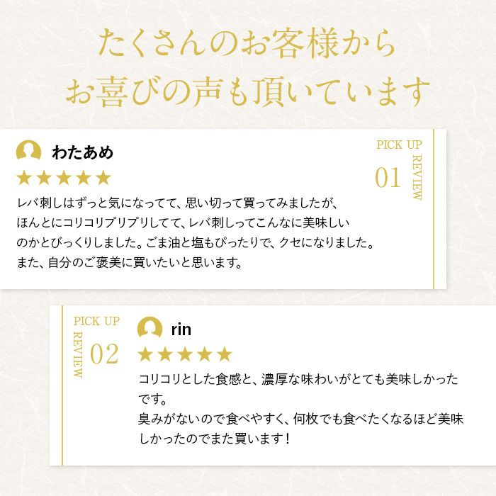 濃厚な深いコクが口の中でとろけ口の中いっぱいに広がります。それでいて脂味が少ないためさっぱりとしており、牛レバーが苦手な方でも食べやすいという声も多くいただいています。