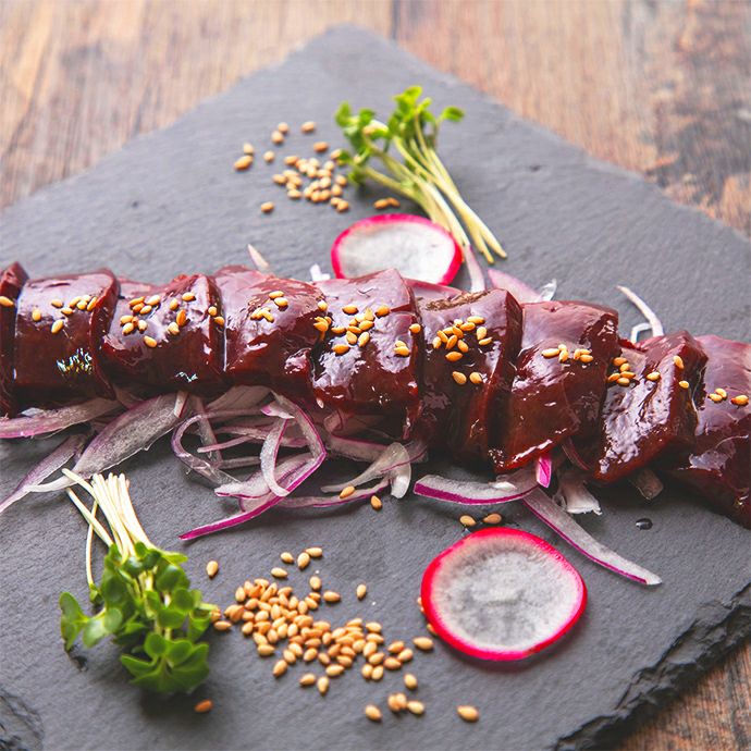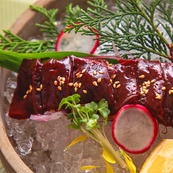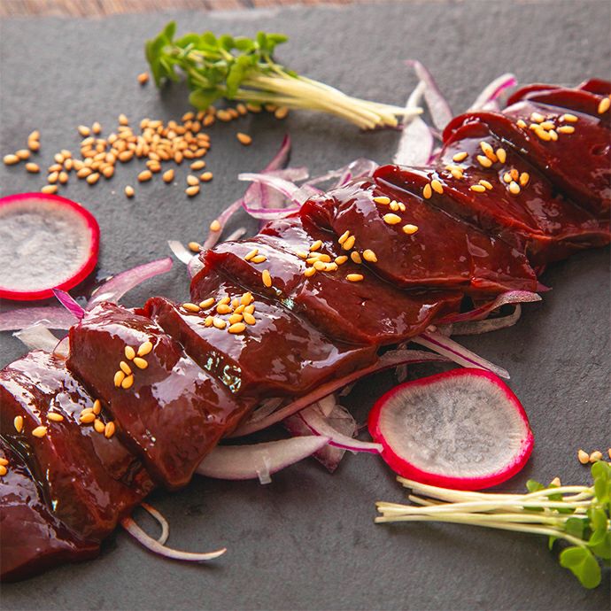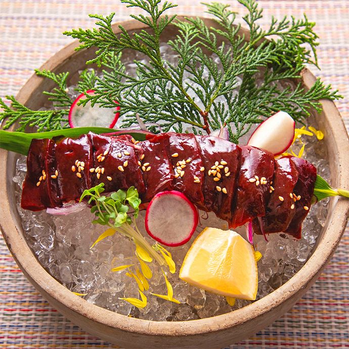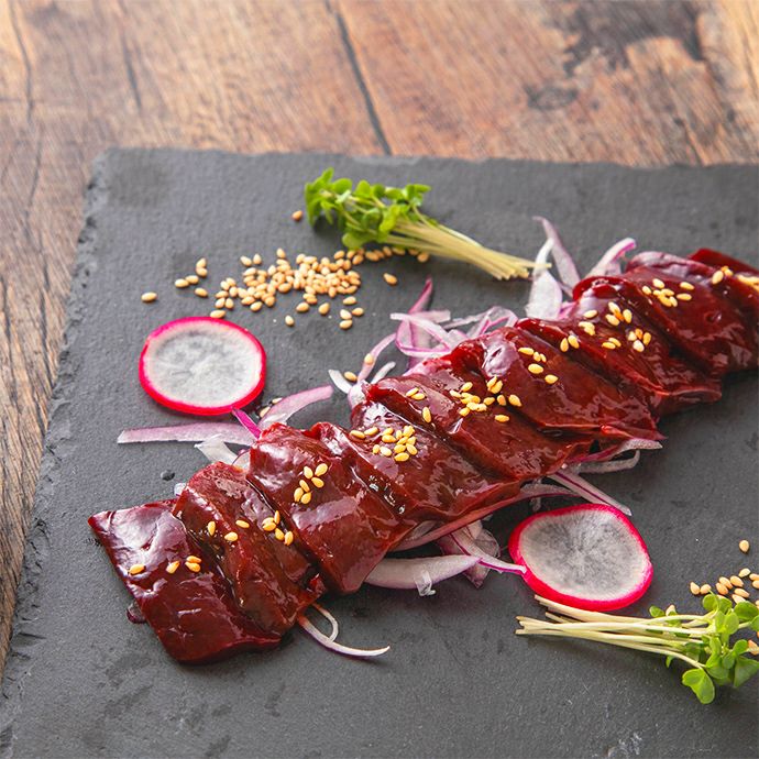 クセや臭みのないピュアな味わいは、まさに新鮮だからこそ味わえる極上の逸品。馬レバ刺しをはじめて食べる方にもおすすめです。口の中でとろけるレバーの濃厚な旨みと、芳醇な甘みをぜひご堪能ください。ごま油と塩で味わえば、至極の口福が広がります。