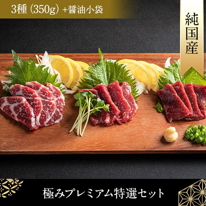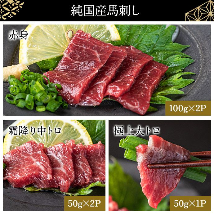 特上赤身、中トロ、大トロ…「これが熊本馬刺しだ!」という特選部位をセットにしました。純国産馬刺しならではの食感、甘み、霜の降り具合はまさにプレミアム。馬刺し初心者の方から食通の方までご納得いただける内容になっています。