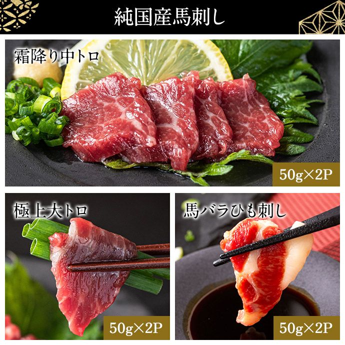 純国産の馬刺しは見事なサシが入ります。ぜひそれぞれのおいしさを食べ比べてみてください。