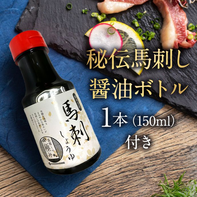 馬刺し専用醤油ボトル(150ml)付きで、解凍後すぐにお召し上がりいただけます。