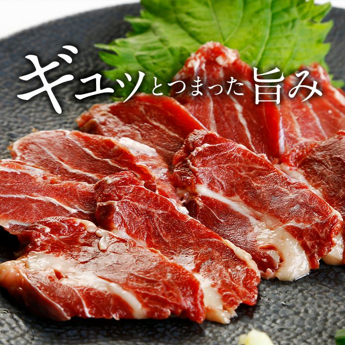 噛むほどに旨みがあふれる「馬バラひも刺し」。その名の通り、あばら骨まわりひも状の希少な部位で、モチモチとした噛み応えのある食感が魅力です。国内でしっかりと肥育することにより、脂の甘みと赤身の旨みがしっかりと引き出され、刺身はもちろん、軽く炙ることでさらに濃厚な味わいを堪能できます。別名「馬カルビ」とも呼ばれ、焼けば脂が香ばしく際立ち、格別の美味しさに。食感とコクを楽しめる一品を、ぜひ食卓でご賞味ください。