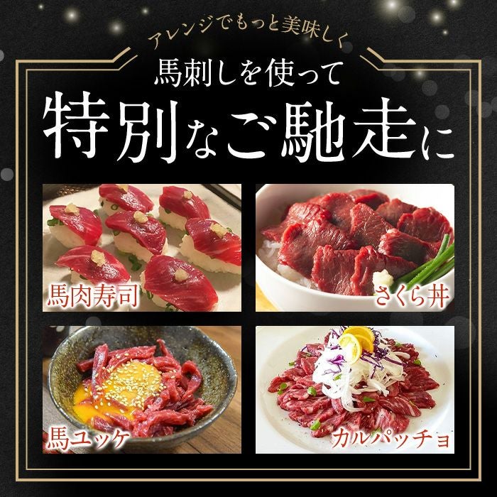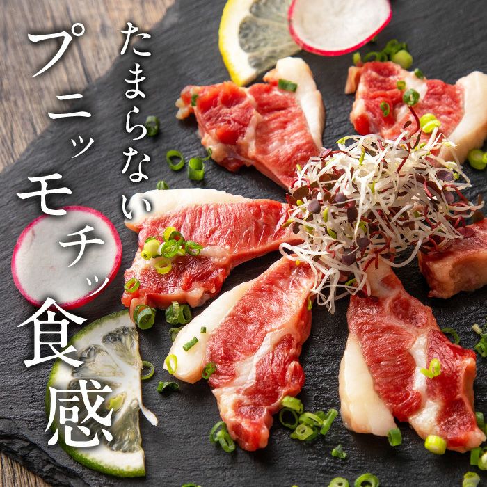 地元熊本で愛される超人気部位「馬バラひも刺し」。あばら骨まわりの細かな肉質が生み出す、モチモチと弾力のある食感が特徴です。噛むほどに赤身の濃厚な旨みと甘みのある脂が口に広がり、後を引く美味しさ。新鮮な刺身で味わってもよし、炙れば脂の旨みが引き立ちまた違った味わいに。地元熊本の飲食店でも大人気の希少部位を、ぜひご家庭でもお楽しみください。