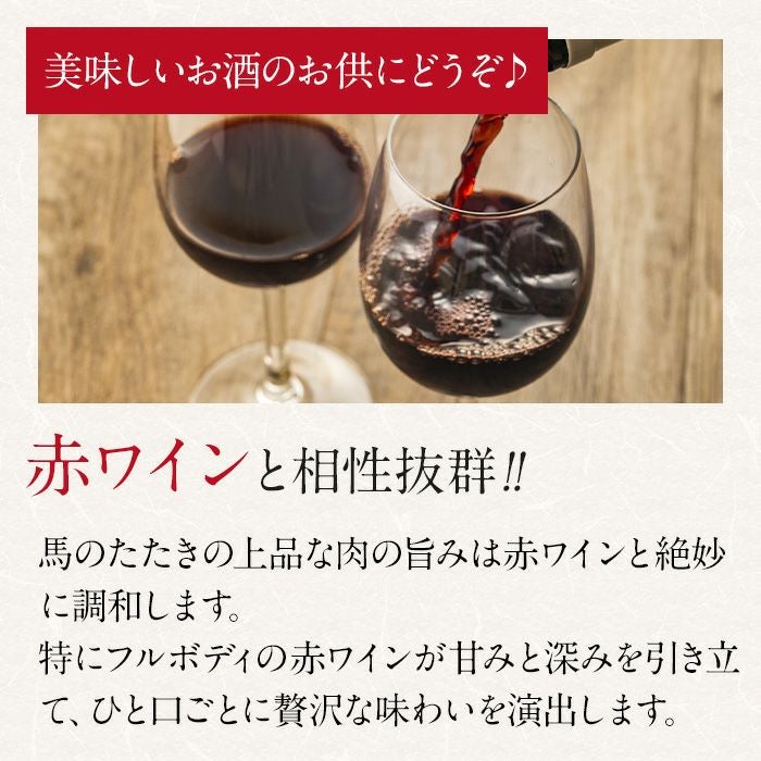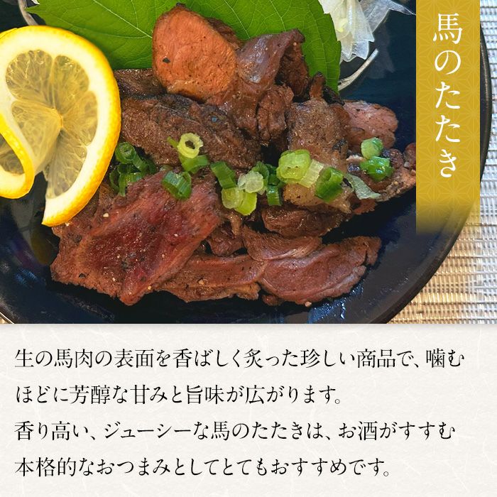 純国産の特上赤身の表面を香ばしく炙り、旨みをギュッと閉じ込めた「馬のたたき」。しっとりやわらかな赤身に、炙りならではの香ばしさが重なり、噛むたびに広がる上品な甘みとコクが絶品です。スライスしてそのままポン酢や塩で召し上がるのはもちろん、薬味を添えてアレンジもおすすめ。低脂肪・高タンパクなヘルシーさも嬉しいポイント。手軽に本格的な味わいが楽しめる、特別な日の一品にぴったりの逸品です。ぜひご家庭でご賞味ください。