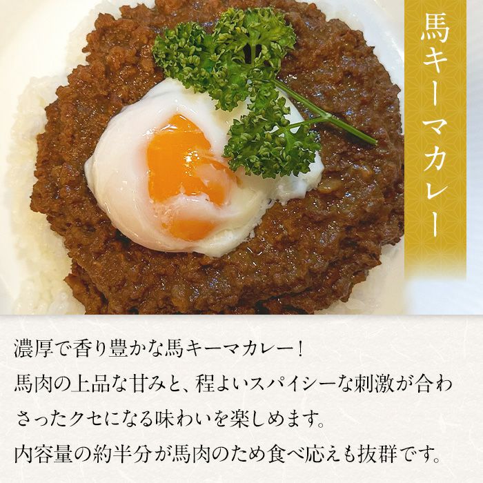 旨みたっぷりの馬挽き肉をスパイスでじっくり煮込んだ「馬キーマカレー」は、コク深くも後味はスッキリ。馬肉ならではの脂の軽さと旨みが絶妙にマッチし、ごはんが止まらなくなる味わいです。スパイシーな辛さの中にほっとする優しさも。レトルトとは思えない本格的な味わいで、忙しい日のごちそうや贈り物にもおすすめ。一口食べれば、じんわりと広がる旨みに虜になること間違いなしの逸品です。