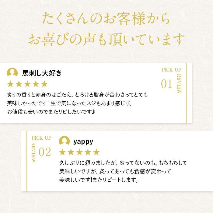馬カルビとも呼ばれる程脂身が美味しい馬バラひもの表面を丁寧に炭火で炙りました。軽く炙ることで、香ばしさとジューシーな脂の甘みが引き立ち、より奥深い味わいに。外は香ばしく、中はしっとりとした柔らかな刺しとはちょっと違った美味しさを楽しめる一品です。お酒が好きな方やそうでない方、自分へのご褒美や贈り物にもぴったりです。