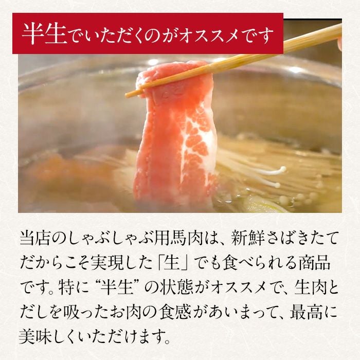 美しい霜降りが贅沢な味わいを生む、「馬霜降りしゃぶしゃぶ」。きめ細かなサシが入った肩バラの部位から、しゃぶしゃぶに最適な部分を厳選し、生でも食べられるお肉をしゃぶしゃぶに最も適した薄さにスライスしました。軽く出汁にくぐらせれば、馬肉の脂の甘みが引き立ち、驚くほど柔らかく口の中でとろけます。赤身の旨みと霜降りのコクが絶妙に絡み合い、ポン酢やごまだれとの相性も抜群。さっと火を通すだけで広がる、馬肉ならではの上品な風味をご家庭でぜひご堪能ください。