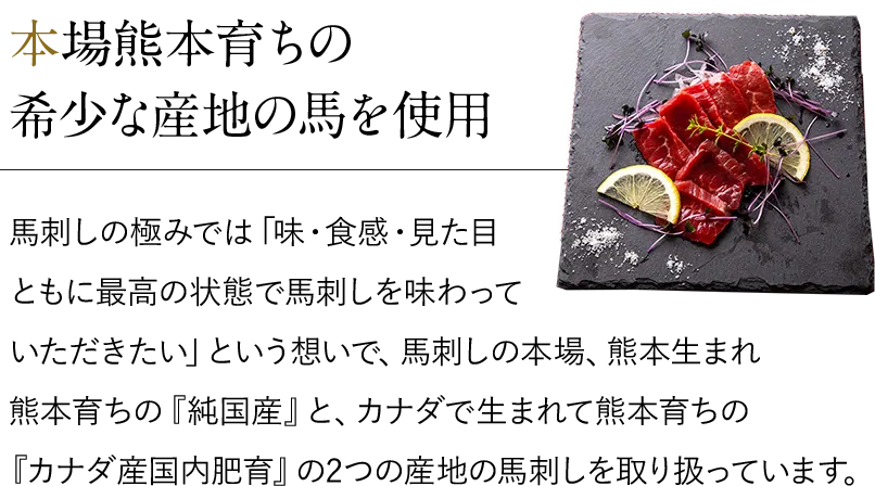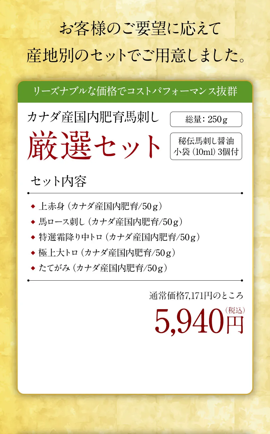 カナダ産国内肥育馬刺し厳選セットの詳細はこちら▶︎